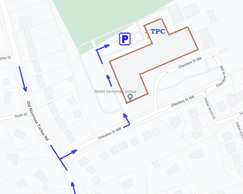 Nesbit Elementary's main entrance is at the end of Cherokee Dr. NW, however, our worship location is in the rear of the building. Turn left immediately before the school building.
